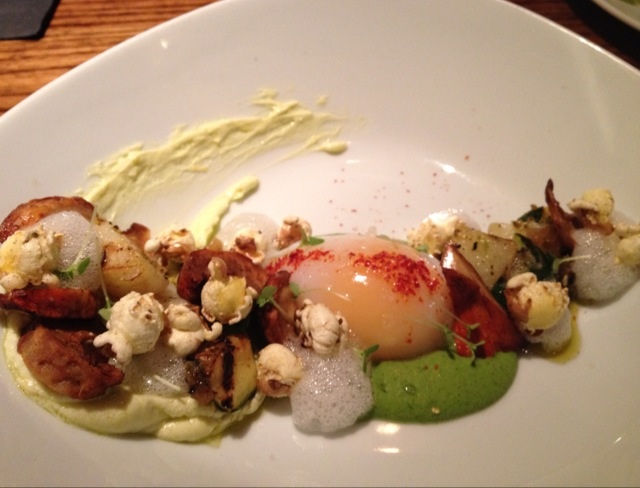 This masterpiece was my screen saver on my phone for months. It took precedence over my new wedding photos. When I heard that my favorite food trailer in Austin (The Odd Duck -irony?) shut down when their brick and mortar store Barley Swine became successful I was devastated, but excited to try a meal there. I was not disappointed. Although my $4 pork belly sliders were no longer a regular on the menu, BS blessed us with this dish. Poached duck egg with popcorn, zucchini salad, goat cheese smear and foam dusted with – bacon powder. Yes you read that correctly, bacon powder. It was too pretty to eat, but I did, and it was, how do you say it?.. Delectable. Yes I know I am about a year too late posting this meal as this is from the 2012 menu, but there is something about this photo that makes me happy.